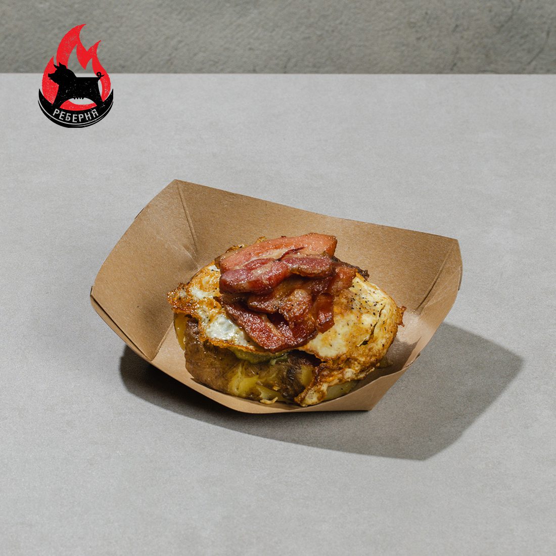 Відварена та обсмажена на грилі картопля у мундирах; мариновані огірки-цукемони, смажене яйце та бекон