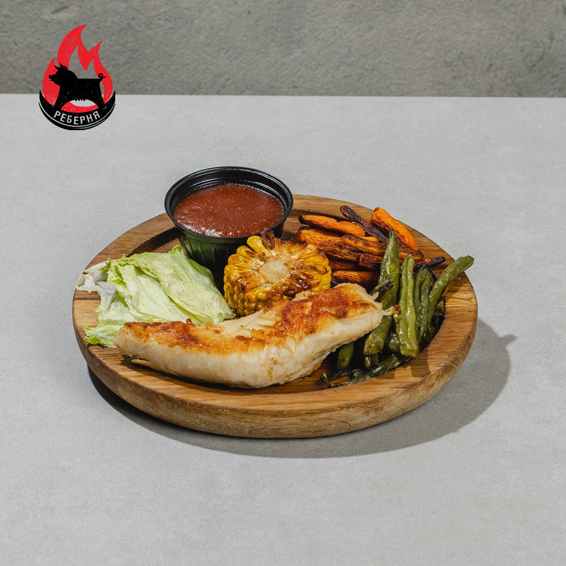Куряче філе, кукурудза, бейбі морква, стручкова квасоля, салат айсберг, соус томатний.