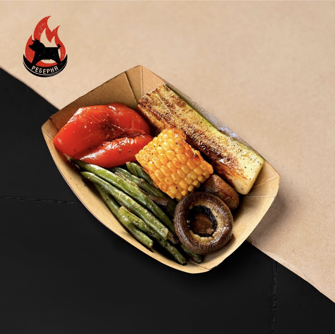 Овочі, приготовлені на грилі: кабачок, печериці, квасоля стручкова, кукурудза, перець болгарський з додаванням солі та перцю